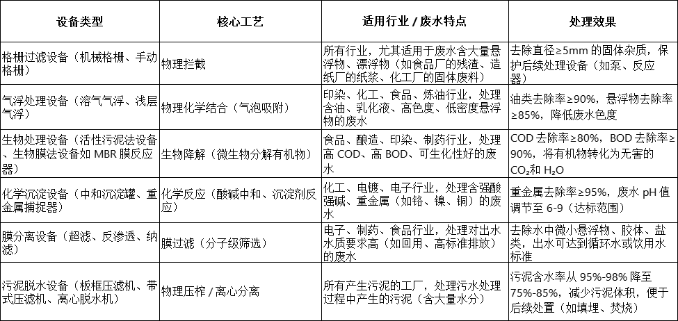不同行業(yè)的工廠廢水成分差異極大(如化工廢水含強酸強堿、重金屬,印染廢水含高色度、難降解有機物,食品廢水含高 COD、高懸浮物),對應的污水處理設備也需 “對癥下藥”。以下是常見設備類型及適用場景: