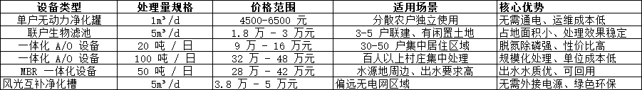 無動力凈化槽 / 化糞池:單戶 1m³/d 規格價格 4500-6500 元,3-5m³/d 聯戶型價格 1.2 萬 - 1.8 萬元,8m³/d 多戶型價格 2.5 萬 - 3 萬元。