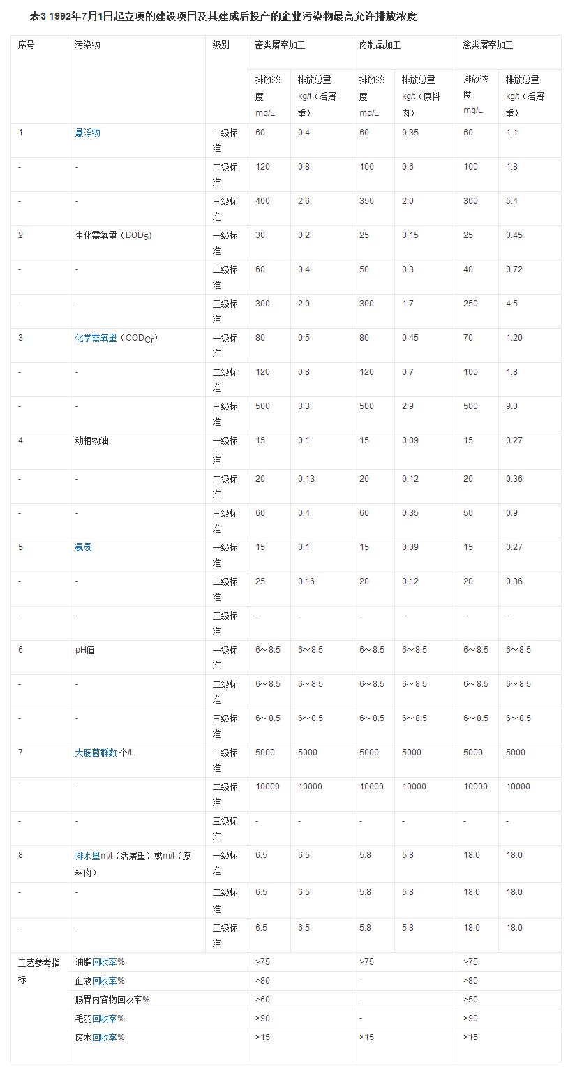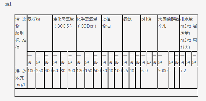 本標準按照不同年限分別規定了肉類加工企業的排水量和水污染物最高允許排放濃度等指標,標準值分別規定為: