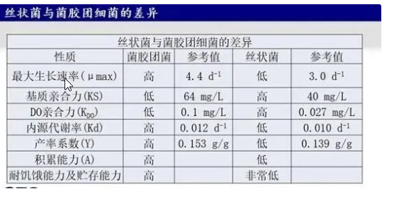 活性污泥是一種混合培養(yǎng)系統(tǒng),其中至少有30種絲狀菌可能導(dǎo)致污泥膨脹。絲狀菌和膠束菌平衡生長不會(huì)出現(xiàn)污泥膨脹的問題,只有絲狀菌比膠束菌生長多才會(huì)出現(xiàn)污泥膨脹。絲狀菌和膠束菌的生理生化特性差異如下表所示。