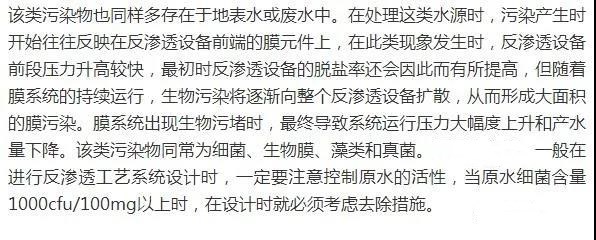 原水中的有機(jī)物成分是最復(fù)雜的,它對(duì)反滲透膜元件的污染和影響也是很難預(yù)料到的。但這一指標(biāo)是設(shè)計(jì)反滲透設(shè)備時(shí)需要認(rèn)真考慮保護(hù)的主要污染物。有機(jī)污染物的來源一般分為兩類:一類是由動(dòng)植物腐爛物形成的天然腐殖有機(jī)物,另一類是由工業(yè)廢棄物污染引起的有機(jī)物。當(dāng)有機(jī)污染反滲透膜時(shí),往往是有機(jī)物被較牢固地吸附在膜表面,清洗起來比較困難。一般而言,有機(jī)物對(duì)膜系統(tǒng)的污染后果最難預(yù)測(cè):水中有些有機(jī)物對(duì)反滲透膜幾乎沒有任何破壞作用,但有些微量有機(jī)物一旦被吸附在膜表面,不但會(huì)污染反滲透膜,甚至?xí)䦟?dǎo)致膜的降解和退化。因此,我們必須高度重視原水中存在的有機(jī)物。因此,在于原則上,在我們?cè)O(shè)計(jì)一臺(tái)反滲透設(shè)備時(shí),當(dāng)原水TOC含量達(dá)到3mg/l時(shí),即使在膜表面上,也不能進(jìn)一步考慮到其進(jìn)一步去除和退化處理過程。