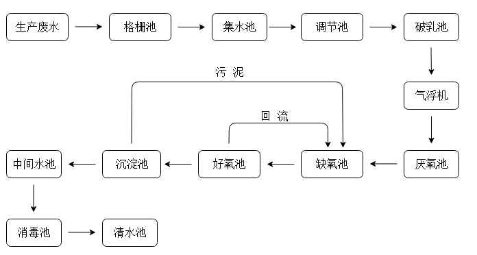 (1)預處理:廢水進入格柵池通過格柵截留大顆粒物質,再自流入調節池以平衡水質水量,使廢水均勻進入后續處理單元;
